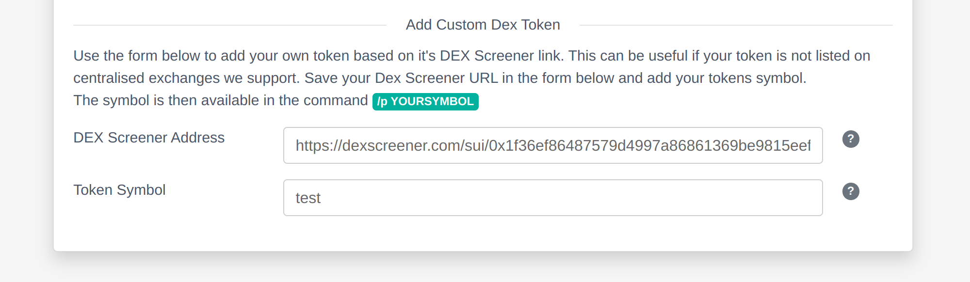 Once added, you can check the price of your custom token by using the `/p` command followed by your symbol. For example, if you set the symbol as "test," you would use `/p test` to retrieve your token's price data.