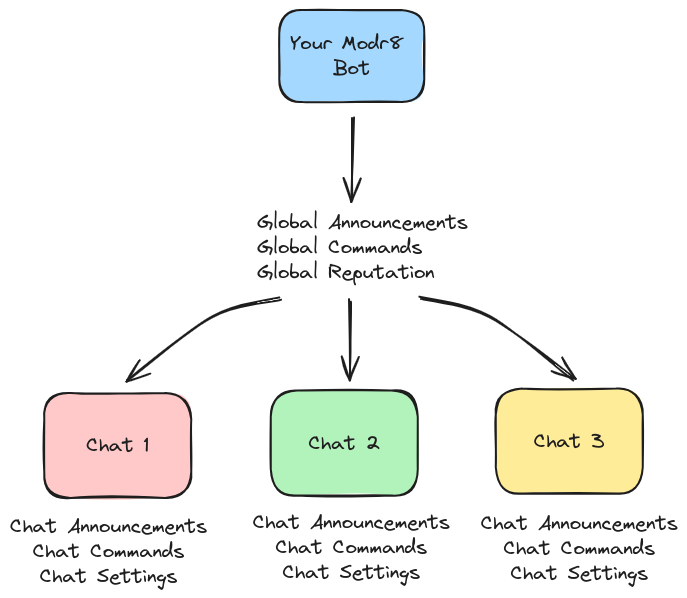 Modr8 supports Global & Multi-Chat Features. This includes, the ability to send an announcement as a one-off broadcast or scheduled and on an interval. The same functionality you have in a single chat, we also have at the global bot level.