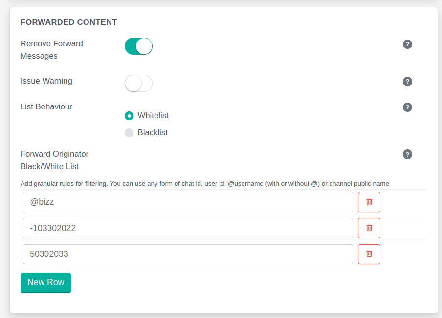 * **Blacklist** - You will provide a list of channels / usernames / ID's that you DO NOT allow forwarded content from.