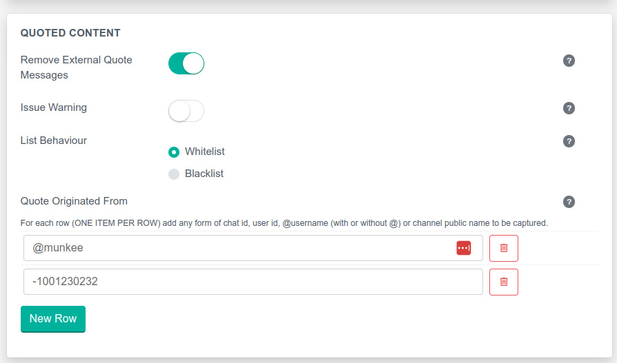* **Whitelist** - You will provide a list of channels / usernames / ID's that you will ALLOW quoted content from.