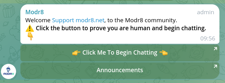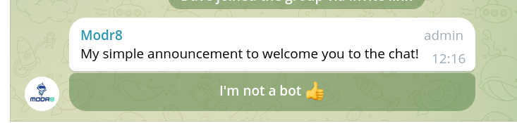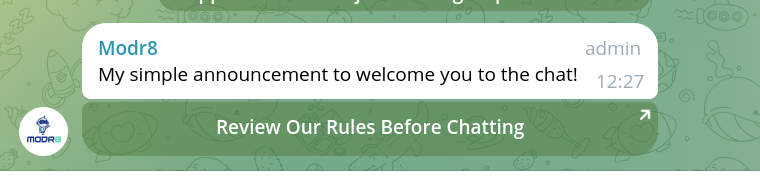 Modr8 supports adding an image, gif or video to your welcome message. If your message is relatively short we will send this image using the native Telegram image functionality with your actual text as a caption. This looks really nice! \