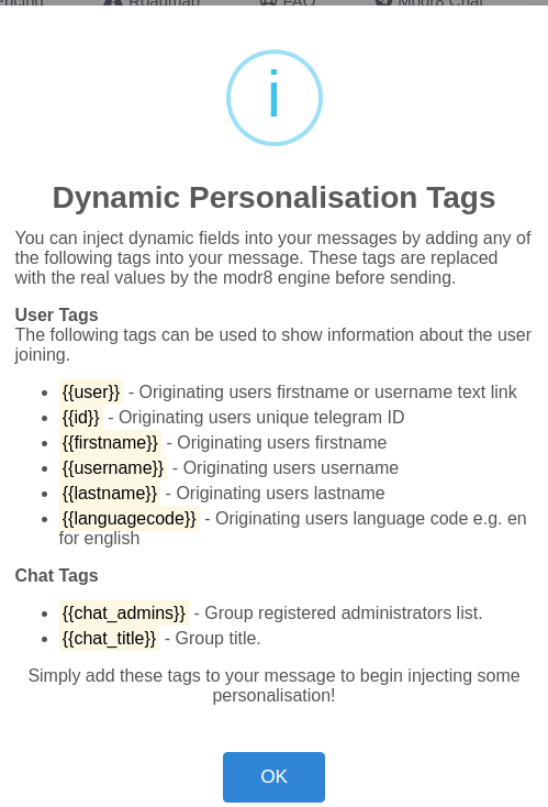 Modr8 offers injectable personalisation tags. To use them simply type the attribute between {{}} braces. The image below shows the tags we support for welcome messages:\ <img src="https://3771905466-files.gitbook.io/~/files/v0/b/gitbook-x-prod.appspot.com/o/spaces%2FtakWTl0Nepjav6MjNphY%2Fuploads%2FI21SxDHm25TosEal5bZ3%2Fimage.png?alt=media&#x26;token=2bec440f-9090-40a3-b25d-2cb4aab0ae5e" alt="" data-size="original">