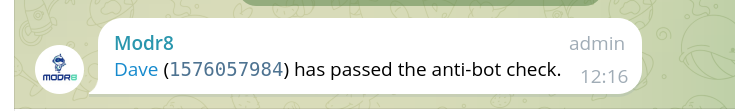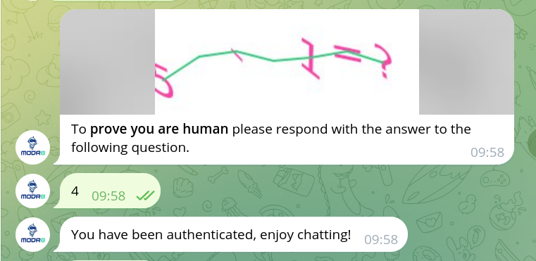 <figure><img src="https://3771905466-files.gitbook.io/~/files/v0/b/gitbook-x-prod.appspot.com/o/spaces%2FtakWTl0Nepjav6MjNphY%2Fuploads%2FTzBhGIqy3VIqcTD5QQsM%2Fimage.png?alt=media&#x26;token=84fed0ca-6c5d-4ab6-80ae-7bee126671ef" alt=""><figcaption><p>Request users to verify they are human by answering a maths question in private chat with your bot</p></figcaption></figure>
