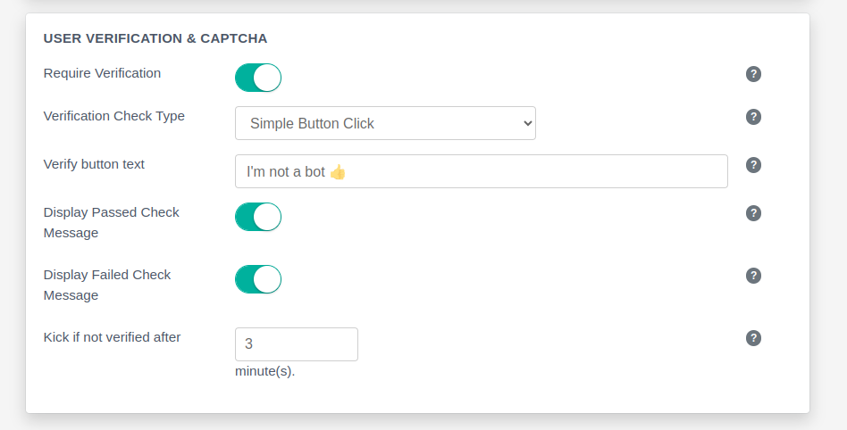 8. Amend the amount of time a user has to complete their check using the `"Kick if not verified"` amount which is set in minutes. We recommend leaving this to 3 minutes.