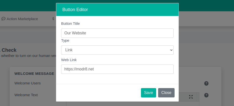<figure><img src="https://3771905466-files.gitbook.io/~/files/v0/b/gitbook-x-prod.appspot.com/o/spaces%2FtakWTl0Nepjav6MjNphY%2Fuploads%2FBgJGlJPwTYULb899hSbG%2Fimage.png?alt=media&#x26;token=7cc0fa9a-bcd0-4f95-bc78-f2efc0d32e37" alt=""><figcaption><p>A welcome message containing personalisation and a button linking to our Modr8 Announcements channel</p></figcaption></figure>