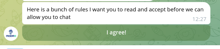<figure><img src="https://3771905466-files.gitbook.io/~/files/v0/b/gitbook-x-prod.appspot.com/o/spaces%2FtakWTl0Nepjav6MjNphY%2Fuploads%2FjN3e3DicyyCrqmKqVKsU%2Fimage.png?alt=media&#x26;token=0221c0d8-7c25-4137-8962-de93b0e9cc47" alt=""><figcaption><p>The user is redirected to the bot in private message and the rules along with accept button are shown.</p></figcaption></figure>