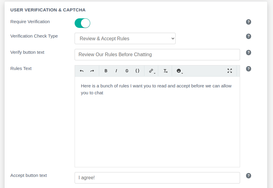 Often community rules are pinned to the chat header or they are mixed into the welcome message itself. You may want to prove users have explicitly accept or read some rules before they can begin to chat in your group. To handle this we recommend you use the Review & Accept Rules verification option. **The rules are displayed in private message** once the user clicks the button on your welcome announcement.